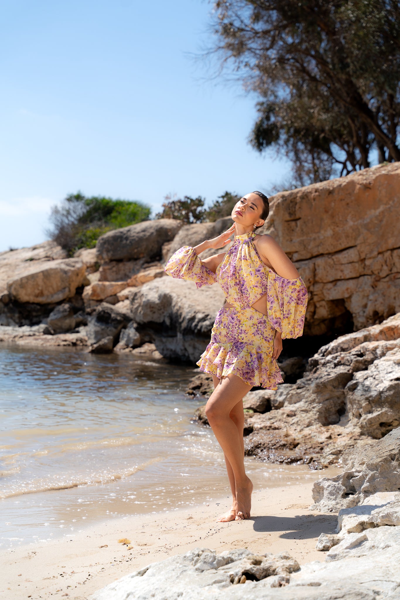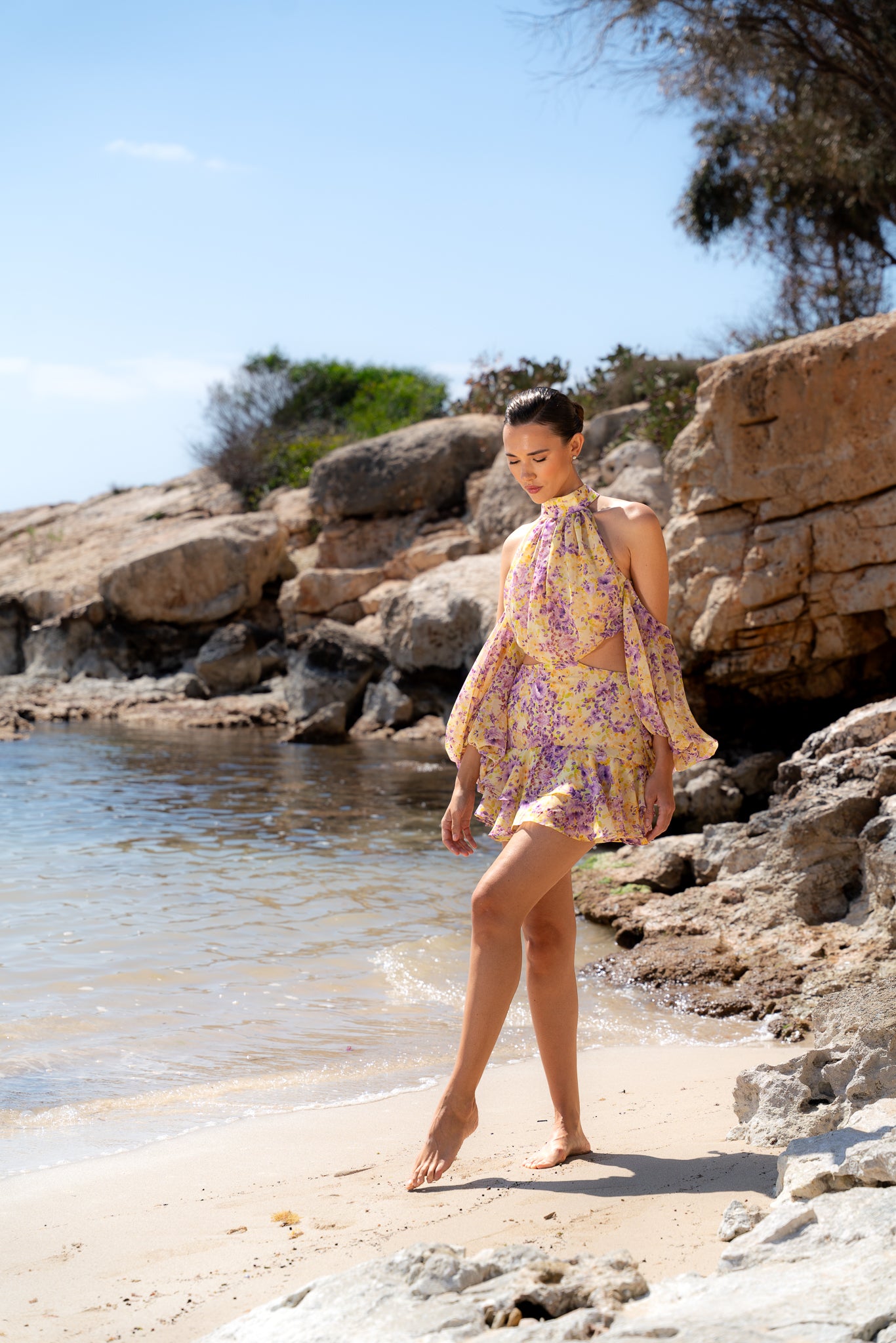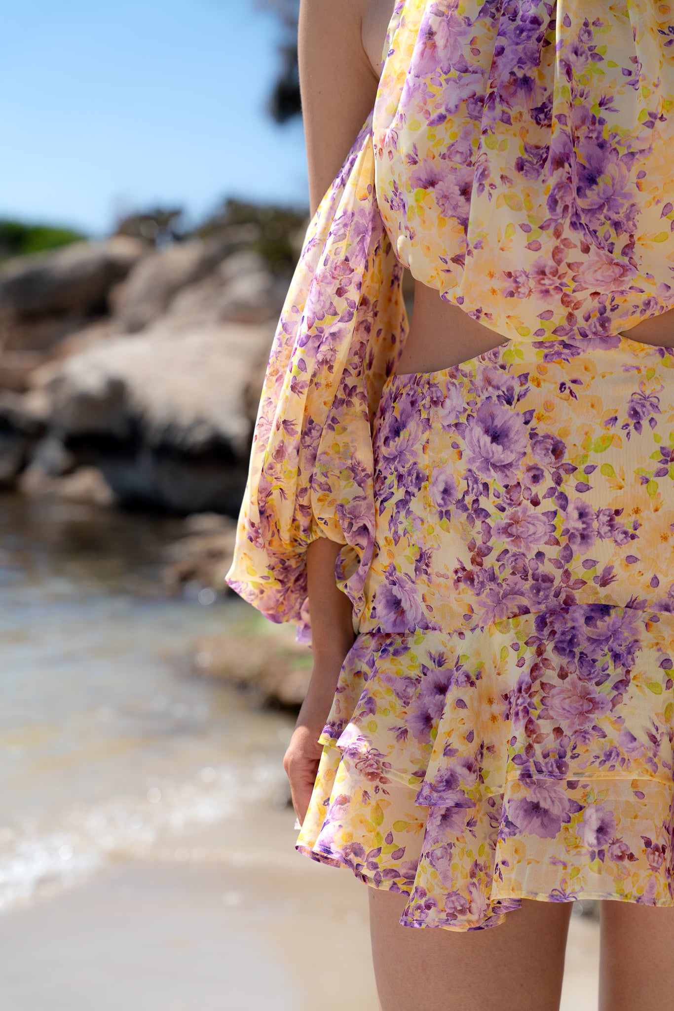 Light, playful, and effortlessly feminine, this mini dress is crafted from chiffon featuring an exclusive in-house print in soft yellow and purple florals. Designed to capture the essence of summer, it blends romantic detailing with a modern silhouette.